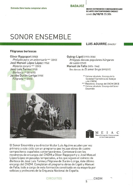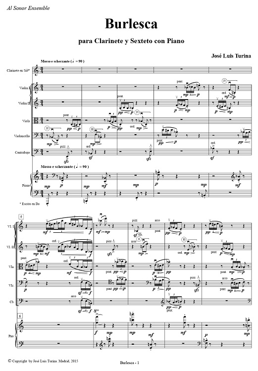 El periodo de estrecha colaboración con el Sonor Ensemble a través de su impulsor y director, Luis Aguirre, iniciado en 2011 con la composición de las Danzas entrelazadas, para flauta, clarinete, percusión y sexteto con piano, y proseguido en 2013 con la obra para voz (o clarinete) y sexteto con piano Callada partida, se cierra en 2015 con la Burlesca, escrita para clarinete y sexteto con piano.