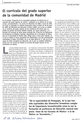Mi artículo "Propuesta de la Comunidad Autónoma de Madrid para el currículo del grado superior de música", publicado en el número 24 de esta revista, correspondiente a los meses de diciembre de 2000 y enero de 2001, en el que se apuntaba un análisis comparativo entre la Orden de 26 de junio de 1999, del Ministerio de Educación y Cultura (MEC), por la que se establecía el currículo del grado superior de las enseñanzas de música para su ámbito de gestión territorial (Madrid incluido, por aquel entonces), y el borrador de currículo de dicho grado realizado por el Servicio de Ordenación de Enseñanzas de Régimen Especial, dependiente de la Consejería de Educación de la Comunidad de Madrid (CM), obliga ahora a este nuevo artículo, en el que se añade un tercer documento de comparación a los dos anteriormente comentados: la Orden 1754/2001, de 11 de mayo (B.O.C.M. nº 120, de 22 de mayo) de dicha Consejería de Educación, por la que se establece definitivamente para los centros de Madrid el currículo del grado superior de las enseñanzas de música.
