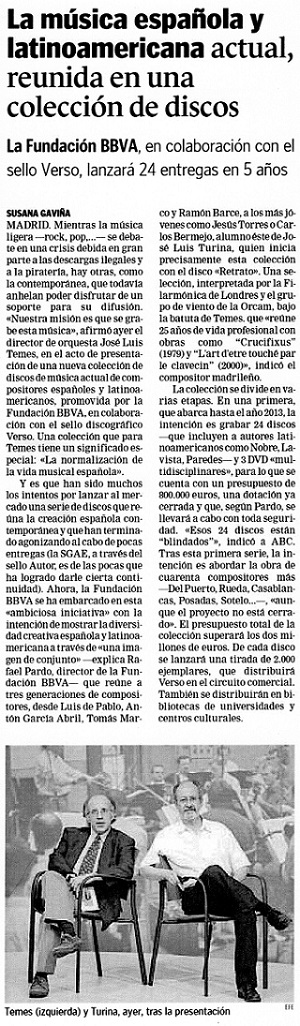 While light music -rock, pop, and the like- struggles with a crisis brought about largely by illegal downloads and piracy, there are other genres, such as contemporary music, that still long for a tangible medium for their dissemination. «Our mission is to have this music recorded». stated conductor José Luis Temes yesterday at the presentation of a new collection of recordings of contemporary works by Spanish and Latin American composers, promoted by the BBVA Foundation in collaboration with the record label Verso. For Temes, this collection holds a special significance: «The normalization of Spanish musical life».