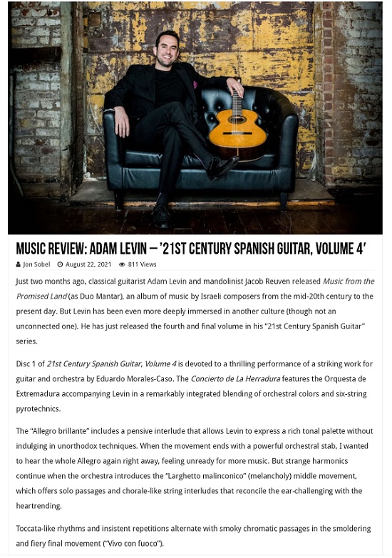 Just two months ago, classical guitarist Adam Levin and mandolinist Jacob Reuven released Music from the Promised Land (as Duo Mantar), an album of music by Israeli composers from the mid-20th century to the present day. But Levin has been even more deeply immersed in another culture (though not an unconnected one). He has just released the fourth and final volume in his "21st Century Spanish Guitar" series.