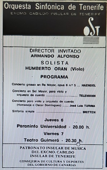 Concerto for Viola and Strings (Homage to Óscar Domínguez) was premiered at the Guimer/aacute; Theater in Santa Cruz de Tenerife by Humberto Orán, accompanied by the Tenerife Symphony Orchestra conducted by Armando Alfonso, on March 6, 1986.