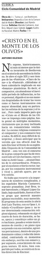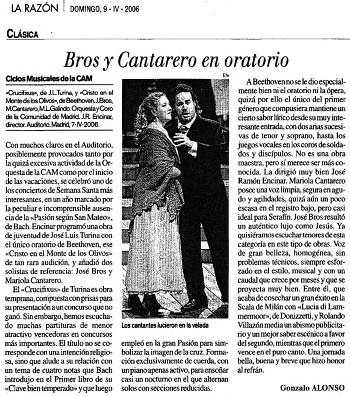 With many empty seats in the Auditorium -possibly caused both by the excessive activity of the CAM Orchestra and by the start of the holidays- one of the most interesting Holy Week concerts took place, in a year marked by the peculiar and incomprehensible absence of Bach's «St. Matthew Passion». Encinar programmed a youthful work by José Luis Turina along with Beethoven's only oratorio, the rarely performed «Christ on the Mount of Olives», and brought in two reference soloists: Joan Bros and Mariola Cantarero.