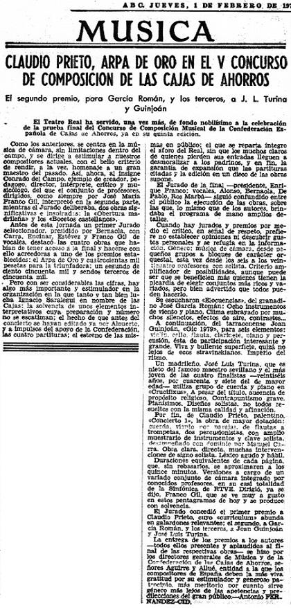 The two third prizes went to Joan Guinjoan [...] and to José Luis Turina, "new to these awards". The best things of this young composer can also be predicted, capable in his Crucifixus of achieving a powerful expressiveness from very pianos nuances and a contrapuntal writing that is as beautiful as it is excellent in workmanship. Turina's office is already that of a mature author; his thought of subtle musicality. From such secure platforms we await the risky flight of his next works. José María Franco-Gil conducted all the scores with the assurance and knowledge -that is, experience- that are usual for him.