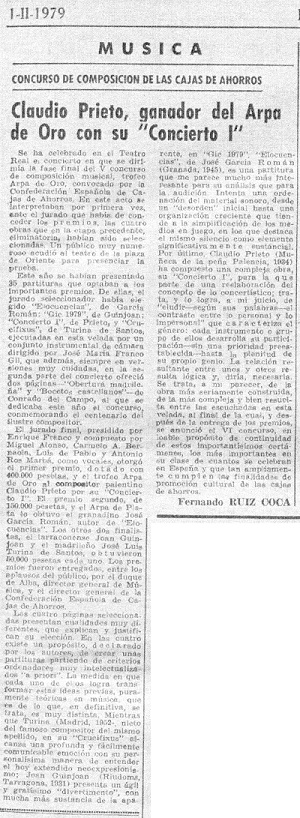 A new final of the Musical Composition Contest has been held at the Royal Theater of our city, sponsored by the Spanish Confederation of Savings Banks, which has entered its fifth edition and to which four works corresponding to José García Román, Juan Guinjoan, José Luis Turina and Claudio Prieto had arrived, according to the order of execution of the program: then, the prize would be awarded in a very different way: thus, to the last mentioned, 400,000 pesetas and the "Golden Harp" trophy would correspond for his work Concert I, the second prize to the one mentioned in the first place, who obtained 150,000 pesetas and the "Silver Harp" trophy awarded to the score Eloquences; there were also two separate third prizes of 50,000 pesetas that corresponded to the works Gic 1979, by Juan Guinjoan and Crucifixus, by José Luis Turina (grandson of the famous Sevillian composer of the same surname), awards that were granted by the final jury, chaired by Enrique Franco and acting as vocals: Miguel Alonso, Carmelo A. Bernaola, Luis de Pablo (composers) and Antonio Ros Marbá, director of the National Orchestra of Spain; These works had been selected by a jury chaired by maestro Alonso Bernaola, along with his colleagues Encinar, Estévez, the pianist Manuel Carra and the conductor Franco Gil.