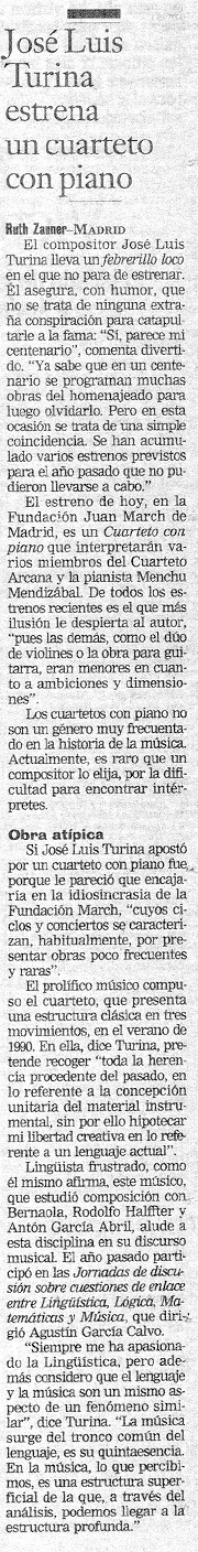 The Piano Quartet is therefore articulated in three independent movements that paraphrase the three normative times: the first in the form of a sonata with two themes; the second, a "lied" in five sections; a "rondo-sonata" (that is, with an intermediate development section) as a conclusion. "What happens -continues Turina- is that by using a type of language that is not governed by the anchors of modulation and tonality, these designs are emptied to become mere syntactic organizations. The work is a process of confrontation between these formal devices (which I consider to be an inalienable historical heritage) and entirely different and, in a certain way, antagonistic elements of language. Thus, the composition begins with a cell in the first measure that seems to suggest the head of a theme and that, in the following measure, is completely stripped of that aspect". Here Turina takes his recent way of working one step further, based on the incessant development of tiny cells (in a kind of synthesis between the late Liszt and Anton Webern), "but always from a perspective in which deep structures are dialectically related very simple with very complex surface structures".