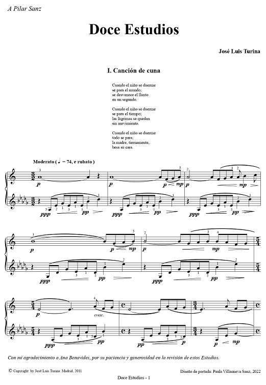 Nor would we be exaggerating if we were to say that each of the Doce estudios para piano, from 2011, is a little gem. Twelve delights, each preceded by a brief illustrative poem by Turina himself (the only Turinians that those of us who follow and admire him have been able to read; there is nothing more exciting than this still unknown side of the composer). If Nieve is a perpetual movement of sweet poetry, a new Canción de cuna is one of almost contemplative stasis; if Legatissimo is a study for the practice of said articulation, Invención proposes with success in its subtle objective a rereading of 18th-century harpsichord literature. This collection of studies is dedicated also successful in its subtle purpose "to Pilar Sanz".