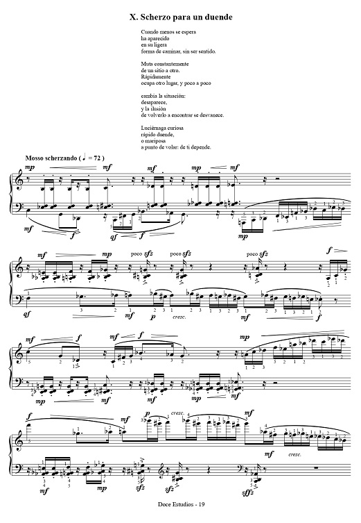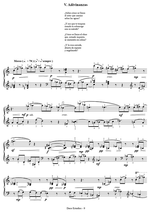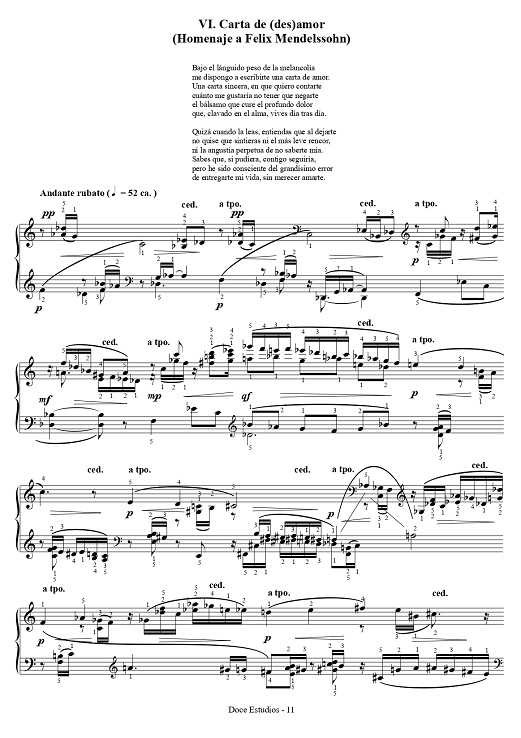 These Twelve Studies were written under the influence of a very special emotional situation, coinciding with the first steps of my relationship with Pilar Sanz, whom I married five years later. And despite the fact that music reaches where words cannot, on this occasion it seemed to me that the sense of each piece lacked a meaning that needed to be expressed in writing. That is why each study is preceded by a short poem, whose objective is none other than to create (or suggest) the appropriate state of mind for its interpretation.