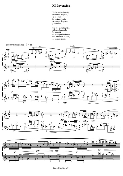 With the aim of enriching the didactic repertoire of this training period, I began to work on a cycle of studies, assuming the "formal" meaning of the term: an autonomous piece, not too extensive, focused almost exclusively on working on a beforehand proposed difficulty (those of Chopin, saving all distances, are the highest model of the genre), but in which the problem to be solved was not only technical, but also interpretive (work with the dynamics, the agogic, the phrasing, the different sound planes, etc.). The set grew in this way for a couple of months until reaching the number of twelve small pieces of these characteristics, thus acquiring both its definitive form and the title of the collection.