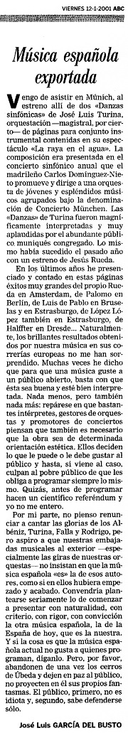 I have just attended in Munich the premiere of «Two symphonic dances» by José Luis Turina, a -masterful, by the way- orchestration of pieces for an instrumental ensemble included in his show «La raya en el agua». The composition was presented in the annual symphonic concert promoted and conducted by the Madrid-born Carlos Domínguez-Nieto, who leads an orchestra of young and outstanding musicians under the name «Concierto München». Turina's «Dances» were magnificently performed and warmly applauded by the large Munich audience in attendance. The same had happened the previous year with a premiere by Jesús Rueda.
