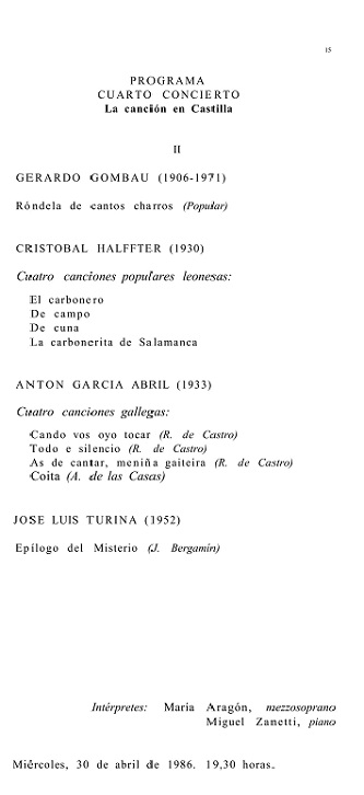 The recording was made by the mezzo-soprano Esperanza Abad, accompanied on piano by the late composer Francisco Guerrero, and was not premiered in concert until 30 April 1986, as part of the cycle "20th century Spanish song" at the Fundación Juan March in Madrid, being performed by María Aragón and Miguel Zanetti.