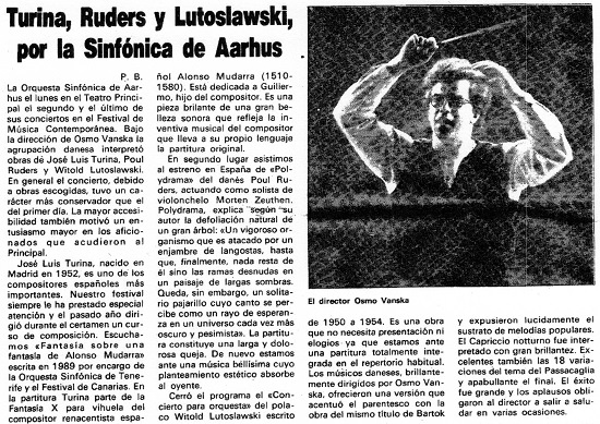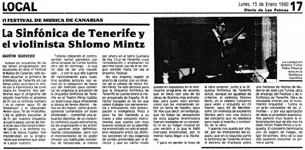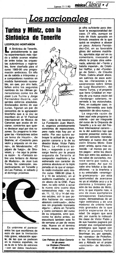 The Tenerife Symphony Orchestra, probably the one that has experienced the fastest and most solid relative progress among all regional and autonomous orchestras, has designed an ambitious program for the 1989-90 season. This program includes a reasonable presence of both performers and composers from our country, while also featuring names from the latest generations, such as José Luis Turina and Jorge Fernández-Guerra, both with world premieres. As part of this season, the Tenerife ensemble will perform a couple of concerts that are also included in the 6th Canary Islands International Music Festival, which has just begun. I want to highlight these concerts here for two reasons. Their program includes «Variations on a Theme by Haydn» by Brahms, «Violin Concerto in E minor» by Mendelssohn, «The Firebird» by Stravinsky, and -here lies the first reason- «Fantasy on a Fantasy by Alonso de Mudarra» by José Luis Turina. These concerts will take place in Tenerife and Las Palmas, respectively, next Saturday and Sunday.