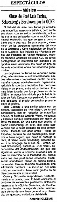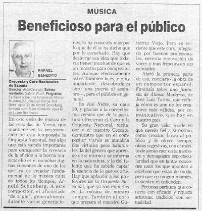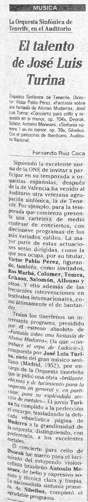 The fantasy of José Luis Turina, which was already premiered in the first of the concerts of our symphony this season, begins somewhat informally in crescendo to form the first of the themes that the metals take, from then on they appear a series of fragments of the fantasy of the Spanish Renaissance vihuelist, either in the different sections or in the tutti, juxtaposed with current elements. After about nine minutes of duration, the work ends with a brilliant epilogue in which brass and percussion prevail over the orchestral tutti. The work is frankly interesting and is followed perfectly despite its novelty and this in good art due to the good work of our orchestra and the good judgment of Víctor Pablo Pérez in dealing with it. Being a new work, it is somewhat risky to judge the version, but I dare to predict that it was magnificent, with good sound, attractive and if not, the author corrects me.