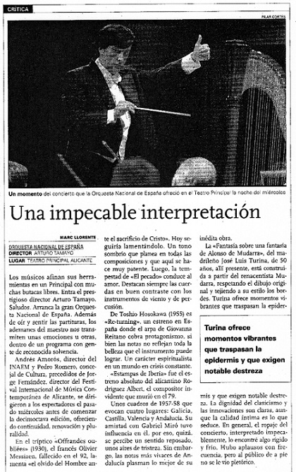 Far more substantial is the brilliant Fantasy on a fantasy by Mudarra, composed by José Luis Turina in 1989. The now fifty-year-old composer from Madrid personally received the well-deserved applause that followed the National Orchestra and Tamayo's precise and vibrant performance.