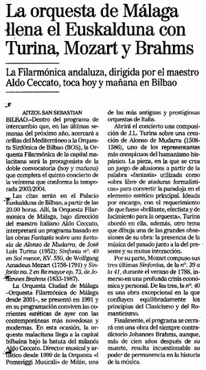 As part of the exchange program that, in the final weeks of next year, will bring the Bilbao Symphony Orchestra (BOS) to the shores of the Mediterranean, the Philharmonic Orchestra of the Malagan capital will take center stage in the two concerts (today and tomorrow) that make up the fifth event in the twenty-concert series comprising the 2003/2004 season.