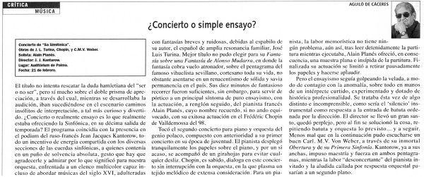 And we can hardly add more, due to space constraints, except to mention that in the second half the Tenerife Symphony Orchestra presented the premiere of «Fantasy on a Fantasy by Alonso Mudarra» by José Luis Turina, a work commissioned by both the Festival and the Tenerife Symphony. A piece of undeniable interest for its orchestral treatment -Turina is a great connoisseur of harmonies- and for its contribution of ideas to expressive intent. We found the performance by Víctor Pablo Pérez and the orchestra to be very fine. [...]