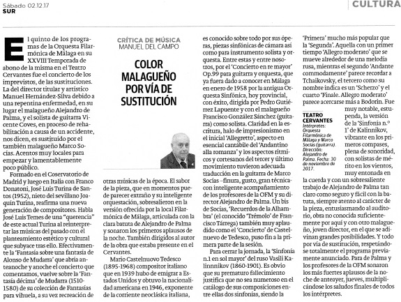 The fifth program of the Málaga Philharmonic Orchestra's 28th subscription season at the Teatro Cervantes turned out to be the concert of the unforeseen -of substitutions. The absence of principal and artistic director Manuel Hernández-Silva, due to a sudden illness, brought in Málaga-born Alejandro de Palma to take his place. Likewise, guitar soloist Vicente Coves, reportedly in rehabilitation following an accident, was replaced by fellow Malagueño Marco Socías. Strong local accents to begin with, though regrettably before a sparse audience.