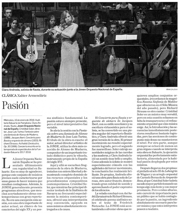 We continue to follow JONDE with genuine affection and support. I still remember the magnificent performance of Der Rosenkavalier in August 2014, also at Baluarte. They are highly trained young musicians, in that formative stage in which everything involves entrance exams for everything, when they feel scrutinized in every way, and during which they must remain in a state of constant tension in search of opportunities. Perhaps the concert at the end of their gatherings is one of the happiest and most rewarding moments of so much effort -for them and for the audience. There is nothing like the sound of a great orchestra you are part of.