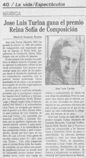 José Luis Turina (Madrid, 1952) has won the 1986 edition of the most important composition prize in Spain: the Reina Sofía, sponsored by the Ferrer Salat Foundation, endowed with one million pesetas.