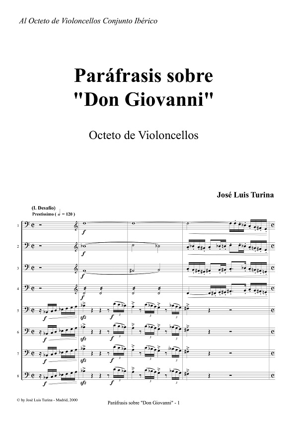 The Paraphrase on "Don Giovanni" is naturally dedicated to the Cello Octet Conjunto Ibérico, which was responsible for the premiere at the Arniches Theater in Alicante, within the 17th International Festival of Contemporary Music, on October 6, 2001, under the direction of Elías Arizcuren.