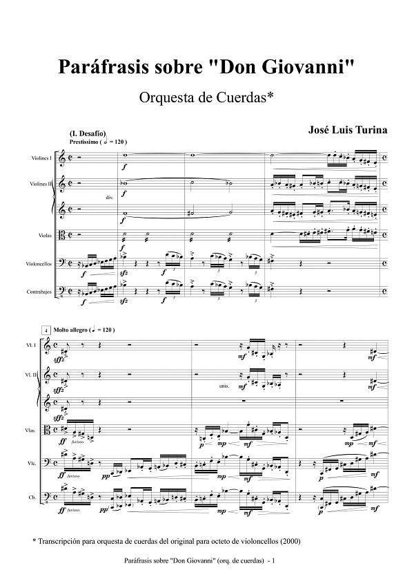 The result was this Paraphrase on "Don Giovanni", whose composition I began in Madrid in mid-September 1998 to interrupt it a few days later, in order to continue the sketch for the opera D.Q. (Don Quixote in Barcelona), on which I had worked feverishly since February of that same year and for which he served me, for a couple of weeks, as a necessary change of scenery. Returning to operatic work, I spent a year and a half more, finishing the sketch and the orchestration of the opera, and then preparing the score, the parts, and everything that was necessary so that, on September 30, 2000, I came up with all honors to the stage of the Gran Teatre del Liceu in Barcelona, and it was not until August of that year that, in Puerto de Mazarrón, I resumed the composition of the Paraphrase, on which I also worked in Barcelona, between rehearsals of D.Q. , until finishing it in Madrid, in mid-October.