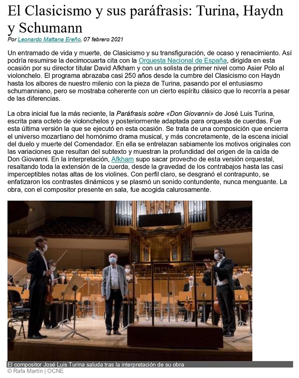 Initially, the Paraphrase on "Don Giovanni" in a version for string orchestra by José Luis Turina, unfolded in turns with quotes from this famous Mozartian opera. A complete exercise in agile counterpoint that is not at all easy to carry out in its first two movements -Challenge and Fight- to lead to a Death, announced here by a last, brief and vigorous rattle, in line with the previous movements.