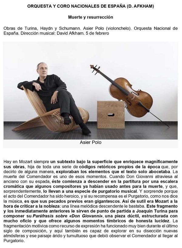 In Mozart there is always a subtext under the surface that magnificently enriches his works, the daughter of a whole series of rhetorical codes typical of the time that, to put it in some way, explored the elements that the text only sketched. The death of the Commander is one of those moments. When Don Giovanni runs the old man through with his sword, he begins to descend in the score by a chromatic ladder that some composers have used before for death, and which, surprisingly, leads him to a kind of musical purgatory. And it surprises because the Commander's act has been heroic, and if his reward is Purgatory, as the music tells us, it is because his previous sins were gigantic. This is how subtle Mozart was when it came to criticizing the nobility: a descending melodic line was enough for him. This fragment and the immediately preceding ones serve as a starting point for Joaquín [sic] Turina to compose his Paraphrase on "Don Giovanni", a flexible piece, structured with great skill and which offers some timbre moments of honest lucidity. The motivic fragmentation as a resource of expression has worked very well during the last century of composition, and here, too, in his dissection, he is capable of exploring new atmospheres and that arid and tumultuous landscape that the Commander must have observed upon arriving in Purgatory.