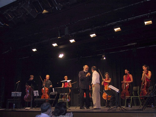 Greeting the Octeto Ibérico and Elías Arizcuren after the premiere of the Paraphrase on "Don Giovanni" (Alicante, October 6, 2001)