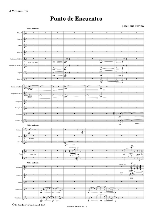 Turina's piece is Punto de encuentro. Written in 979 (and premiered in Las Palmas in 1983 by Reinhard Peters with the Gran Canaria Philharmonic Orchestra), it acquires its fullest dimension in this register. The author's first work for large orchestra, the title alludes to a certain formal structure but also, perhaps unconsciously, to the fusion in a personalized concept of the cosmos of reflections and influences that press the imagination of a receptive and at the same time original artist. Turina's absorptive capacity mobilizes his concern towards all aspects of form and finds in the ease of language the best transfiguring response. The variation technique -less apparent than induced as a common thread- fosters the tentacular game of diversity in a single movement that proposes more or less syncretic follow-ups without neglecting the proportions of the continuum. From the solistic reliefs and the spatiality of the small instrumental combinations, to the "massive" sound; from miniaturist graphics to expressive gesture; and from the freezing of contextualized intervalic work in silence, to the verbosity of a great apparatus, Turina develops the presentation letter of a sumptuous and sometimes protean style, which in later works reaches more precise elaboration.