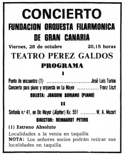 Between both masters of the past [Liszt and Mozart], the absolute premiere (a fact that has not been sufficiently outstanding) of Punto de encuentro (theme with variations) by José Luis Turina. As it is an event of the strictest contemporaneity, I think it deserves a separate paragraph.