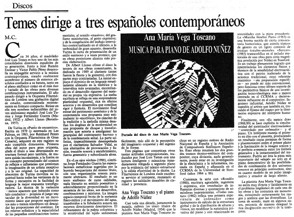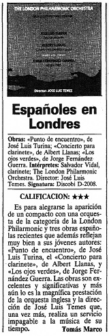 Is cause for joy the appearance of a compact disc with an orchestra of the London Philharmonic category and three recent Spanish works that also represent very well their young authors: Punto de encuentro, by José Luis Turina, the Clarinet Concerto by Albert Llanas, and Los ojos verdes (The green eyes), by Jorge Fernández Guerra. The works are excellent and significant, and even more so is the magnificent performance of the English orchestra and the direction of José Luis Temes who, once again, performs an invaluable service to the music of his time.
