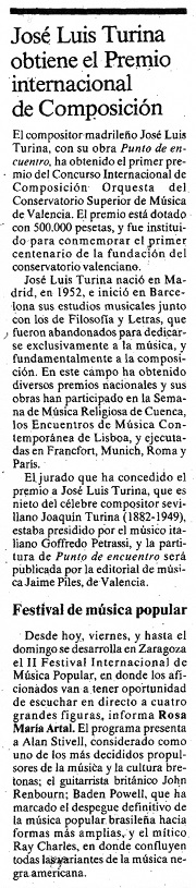 The composer José Luis Turina, has obtained the first prize in the International Composition Competition [Centennial of the] Orchestra of the Superior Conservatory of Music of Valencia with his work Punto de encuentro. The award is endowed with 500,000 pesetas and was instituted to commemorate the first centenary of the founding of the Valencian Conservatory.