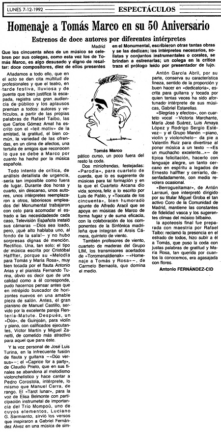 Well then, this is going to be like the telephone directory, which, according to the famous madman, is full of characters. A beautiful tribute was paid to Tomás Marco by his colleagues and peers -not only a composer but also a critic, organizer, revitalizer of musical life, author of books, and so on. He does it all, and he does it well. In short, he is the «indispensable man». This is widely recognized, and that is why he has been honored with this musical crown -something usually reserved, when it happens at all, for when the honoree is already a gloomy and withered corpse, as Don José Zorrilla once put it. Fortunately, at fifty, Tomás is as fresh as a rose.