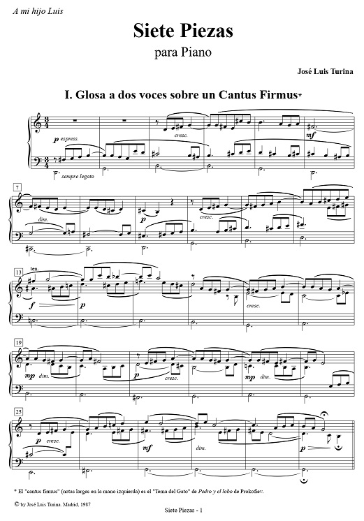 The first piece, Gloss for two voices on a cantus firmus, is an eminently contrapuntal work, in which the right hand develops a counterpoint for two voices, in a clearly imitative style, while the left hand develops only the cantus firmus to the which alludes to the title of the piece, which is none other than the Cat’s Theme from Peter and the Wolf, by Sergei Prokofiev. Said theme, exposed in the original work by the clarinet, is here transformed beyond recognition by giving each of its notes a very long length, as was customary in the treatment of the cantus firmus in ancient polyphony.