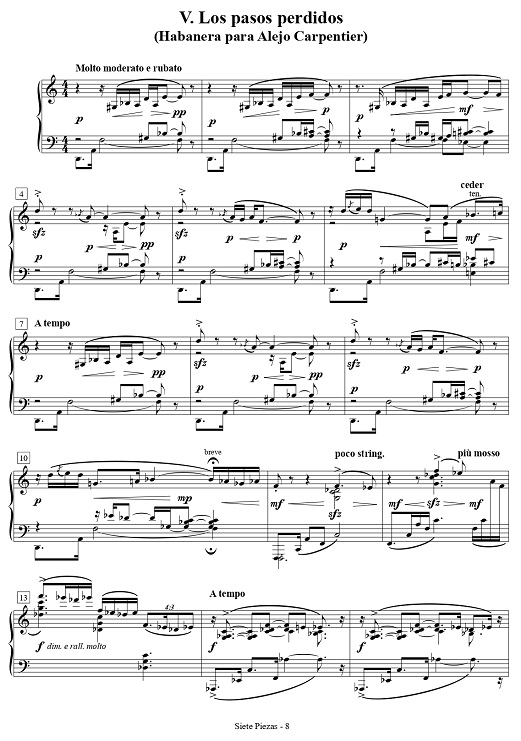 The fourth piece is entitled Through the mirror, alluding to the fact that the writing of both hands is absolutely symmetrical throughout the entire movement, with the imaginary mirror in which one hand reflects the other being located on the central D of the keyboard. The fifth piece, entitled The lost steps and subtitled Habanera for Alejo Carpentier, in just remembrance of his splendid novel, recreates a stylized habanera in such a way that it is more suggested than anything else: the melody begins several times, but does not seem to want to be never completed.