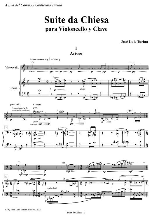 Suite da chiesa was started in Vallgorguina (Barcelona) in August 2021 and completed in Madrid in November of the same year. Dedicated to my son Guillermo and his wife, the harpsichordist Eva del Campo, it was premiered by them as the culmination of my induction as a member of the