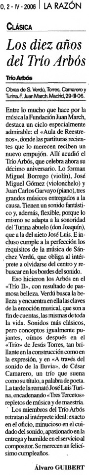 Among the many contributions of the Juan March Foundation to music, one particularly admirable initiative stands out: the «Aula de Reestrenos» (Re-Premieres Classroom), where recent scores worthy of recognition receive a new push. It was here that the Trío Arbós played, now celebrating its tenth anniversary. The ensemble consists of Miguel Borrego (violin), José Miguel Gómez (cello), and Juan Carlos Garvayo (piano) -three outstanding musicians devoted to their cause. Their sound is fantastic and, moreover, flexible, as it adapts just as well to the sonorities of the elder Turina (Joaquín) as to those of his grandson, José Luis. It even meets the exacting demands of Sánchez Verdú's music, which compels the performer to forget the center and explore the edges of sound.