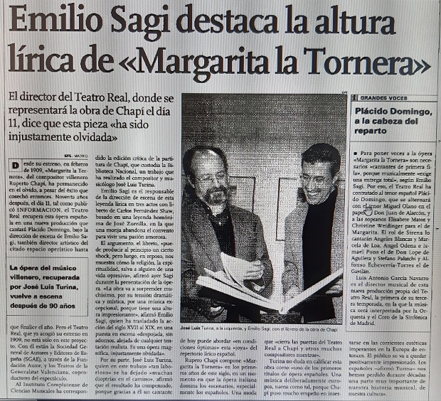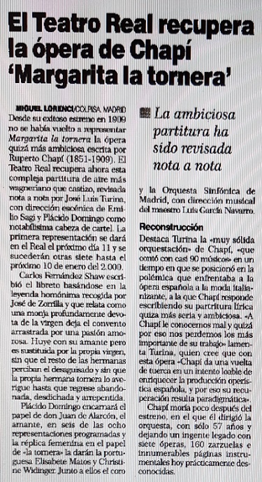 Margarita la Tornera en el Teatro Real, en febrero de 1909, debió de levantar una gran expectación, propiciada por las polémicas continuas, animadas unas veces y enconadas otras, acerca de la ópera española que, tanto Chapí como una buena parte de los compositores del momento, sostuvieron en esos años en la prensa de la capital con los entonces dirigentes del coliseo madrileño. Y que esta ópera cayera después en el olvido resulta aún más incomprensible si se tiene en cuenta el enorme éxito alcanzado en su estreno, que llevó a que fuera nuevamente programada en la temporada siguiente, y que llegara a ser estrenada en el Teatro Colón de Buenos Aires. Sólo la extrema dureza del público español para con algunos de sus artistas más insignes puede justificar tamaño sinsentido.
