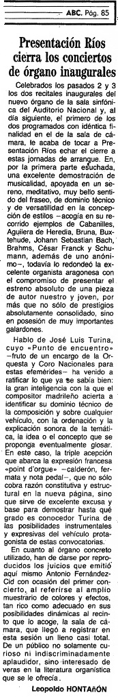 Hablo de José Luis Turina, cuyo «Punto de encuentro» -fruto de un encargo de la Orquesta y Coro Nacionales para estas efemérides- ha venido a ratificar lo que ya se sabía bien: la gran inteligencia con la que el compositor madrileño acierta a identificar su dominio técnico de la composición y sobre cualquier vehículo, con la ordenación y la explicación sonora de la temática, la idea o el concepto que se proponga eventualmente glosar. En este caso, la triple acepción que abarca la expresión francesa «point d'orgue» -calderón, fermata y nota pedal-, que no sólo cobra razón constitutiva y estructural en la nueva página, sino que sirve de excelente excusa y base para demostrar hasta qué grado es conocedor Turina de las posibilidades instrumentales y expresivas del vehículo protagonista de estas convocatorias.