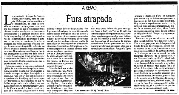 Salvadas las ideas iniciales, el libreto de Justo Navarro es una empanada mental que forcejea a la contra del espectáculo. Pero lo peor, a distancia, es la música, lúgubre y desprovista del menor poder imaginativo, hibridador y no digamos transgresor. Hay que estar muy poco informado para encargar una ópera a José Luis Turina. El siglo que termina ha producido partituras poco sopor tables a oídos no reeducados, pero dotadas de una fría tensión y meditación internas que les confiere el marchamo de grandes obras de arte. Turina parecer ser uno de los muchos herederos de este reino a los que la herencia pesa demasiado. Pongan la ópera -música y libreto, sin Fura- en cualquier gran escenario y verán como no perdonan a los autores ni sus más entregados amigos. Hoy se puede experimentar mucho con la música si se quiere renovar el género. El mismo fin de semana, en Lleida, Albert Sardà estrenaba una ópera a partir de una historia de Miquel de Palol. Tengan por seguro que es más interesante.