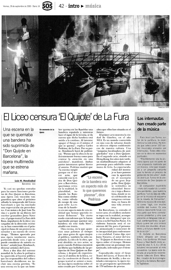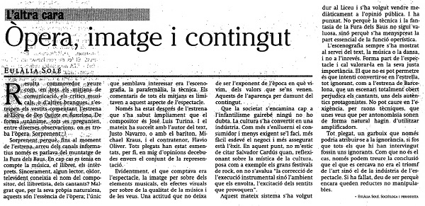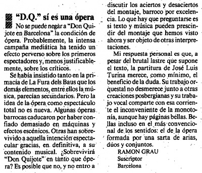 Pero al reciente "D.Q." que se ha estrenado en el Liceu no se le ha tratado como a un impuesto revolucionario que hay que soportar, ni se le ha juzgado con la deferencia de lo que no resistiría un envite. De hecho, los envites que ha recibido este "D.Q." han sido prácticamente unánimes por parte de comentaristas y críticos, a menudo francamente irritados. A "D.Q." se le ha tratado como un producto sano, normal, lleno de energía y vitalidad: es decir, como un producto de éxito, con nueve representaciones previstas como si fuera una obra del gran repertorio, todas las localidades vendidas y un ambiente mediático abrumadoramente favorable. Envidiable.