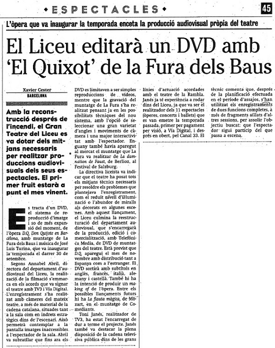 El Gran Teatre del Liceu acaba de entrar con fuerza en la vanguardia de la creación audiovisual al lanzar la primera grabación en DVD de una ópera que utiliza a fondo todas las grandes posibilidades de este nuevo formato. La ópera en cuestión es "D.Q.", la nueva creación de La Fura dels Baus, sobre música de José Luis Turina, que abrió la presente temporada.