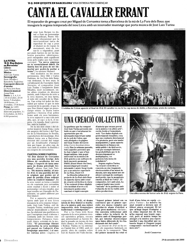 Por otra parte, también encontraron acomodo en D.Q. fragmentos de obras muy anteriores: De ese modo, para el collage de grabaciones superpuestas sobre el que se desarrollan las vertiginosas imágenes de vídeo de la escena del huracán del tercer acto utilicé como base la música del tercer movimiento íntegro (La tormenta) de Ocnos (1986); y las tres arias de Don Quijote del segundo acto son una variación amplificada de la primera de las Cinco canciones amatorias (la Cançó de la llassa), de 1994. Por último, los preludios con que comienza cada acto son los tres movimientos que configuran la obra orquestal El arpa y la sombra, que finalmente encontraron en D.Q. su verdadero sentido operístico originario. D.Q. (Don Quijote en Barcelona) se estrenó en el Gran Teatre del Liceu de Barcelona el 2 de octubre de 2000, siendo objeto de una polémica mediática posterior directamente proporcional a la expectación previa generada con motivo del estreno, y de la que dan testimonio las críticas, artículos y reportajes que figuran más abajo. La última función tuvo lugar el 10 de octubre, tras haberse ofrecido ocho representaciones de la ópera.