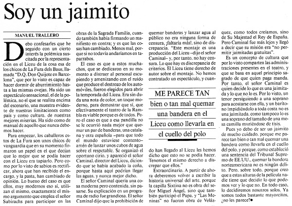 quemar banderas y lanzar agua al público no era ninguna forma de censura, ¡faltaría más!, sino de discrepancia. "Este montaje es una producción del Liceu -dijo el señor Caminal- y, por tanto, no hay censura. Lo que hay es discrepancia de criterios. El Liceu tiene derecho de autor sobre el montaje. No hemos contratado un espectáculo, y cuando han llegado al Liceu les hemos dicho que esto no se podía hacer. Tenemos el mismo derecho a discrepar que ellos".