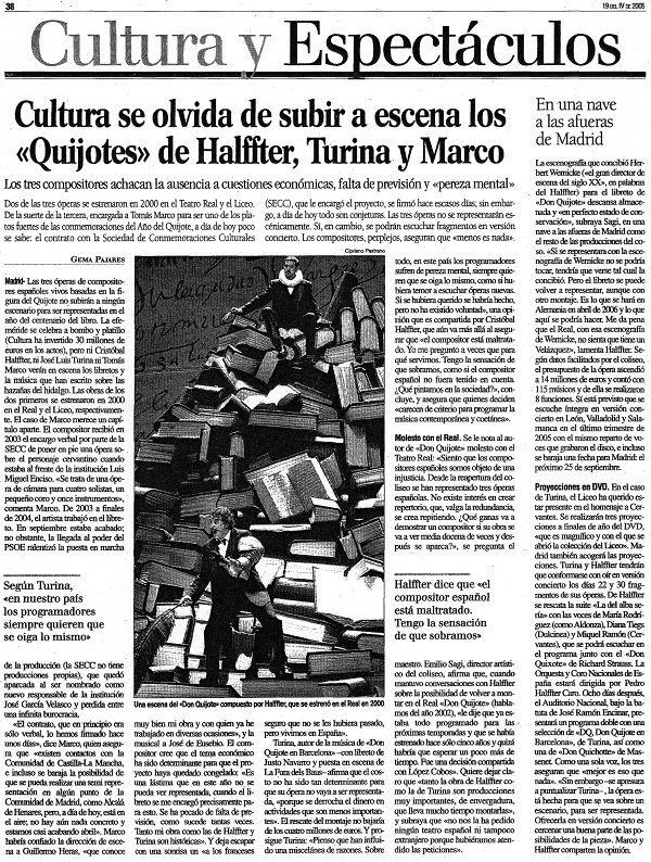 Las tres óperas de compositores españoles vivos basadas en la figura del Quijote no subirán a ningún escenario para ser representadas en el año del centenario del libro. La efeméride se celebra a bombo y platillo (Cultura ha invertido 30 millones de euros en los actos), pero ni Cristóbal Halffter, ni José Luis Turina ni Tomás Marco verán en escena los libretos y la música que han escrito sobre las hazañas del hidalgo. Las obras de los dos primeros se estrenaron en 2000 en el Real y el Liceo, respectivamente. El caso de Marco merece un capítulo aparte. [...] «Tanto mi obra como las de Halffter y Turina son históricas». Y deja escapar con una sonrisa un «a los franceses seguro que no se les hubiera pasado, pero vivimos en España».