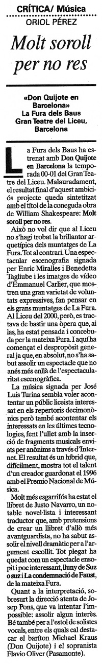 La Fura dels Baus ha estrenado con Don Quijote en Barcelona la temporada 00-01 del Gran Teatro del Liceu. Desgraciadamente, el resultado final de este ambicioso proyecto queda sintetizado con el título de la conocida obra de William Shakespeare: Mucho ruido por nada.